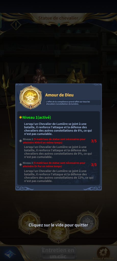 Le choix des statues et des compétences bonus dépendra de votre stratégie globale et de la composition de votre équipe, impactant la manière dont vos Chevaliers se battent pour la justice.